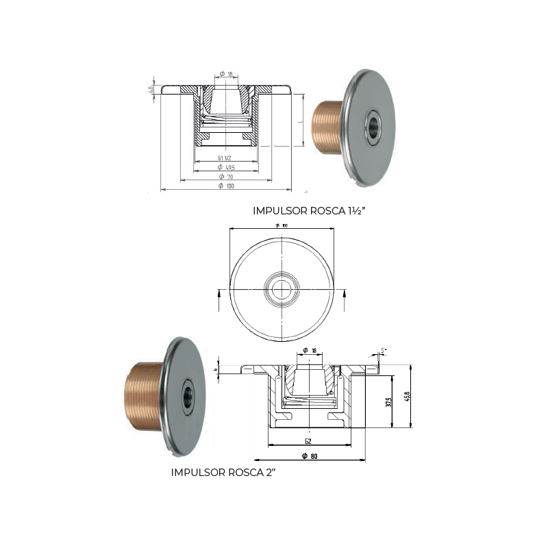Impulsor en bronce, rosca macho 1 1/2 de 40mm o 2" de 40mm.