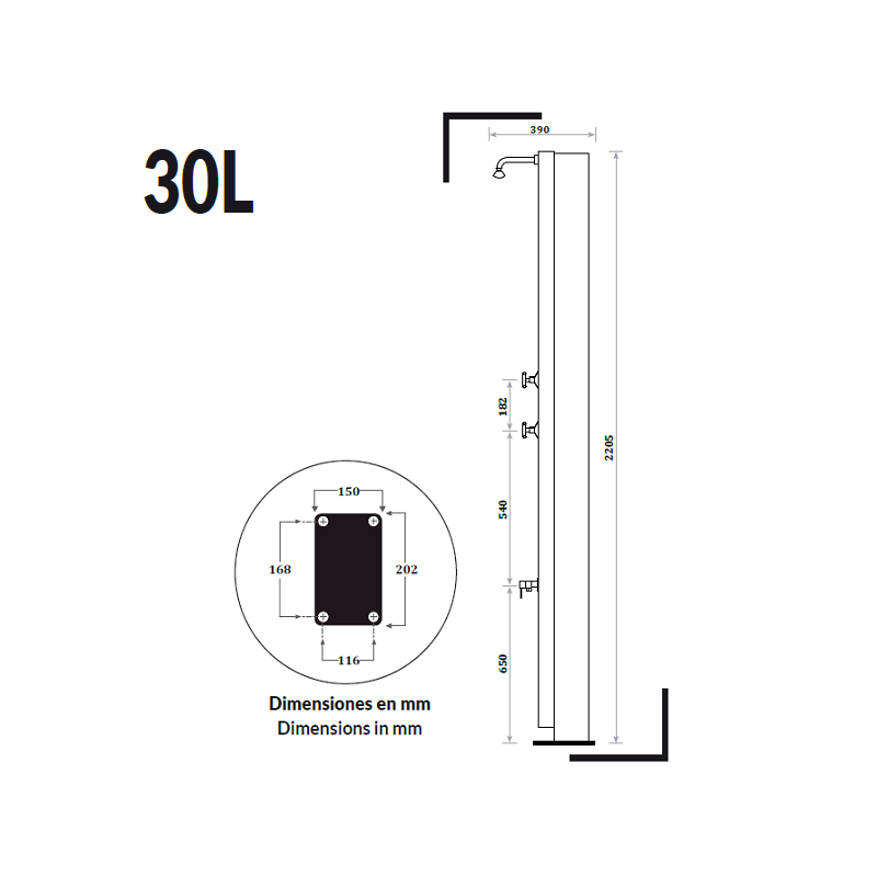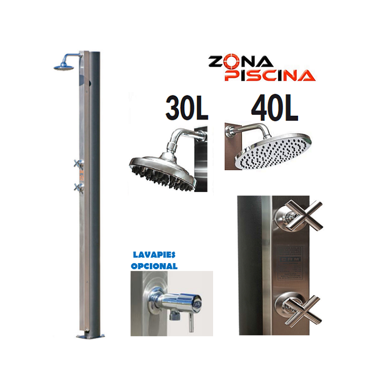 Ducha solar de 30 y 40 litros para piscinas, jardín serie Inoxidable, colector fabricado en aluminio y tratamiento anticorrosivo.