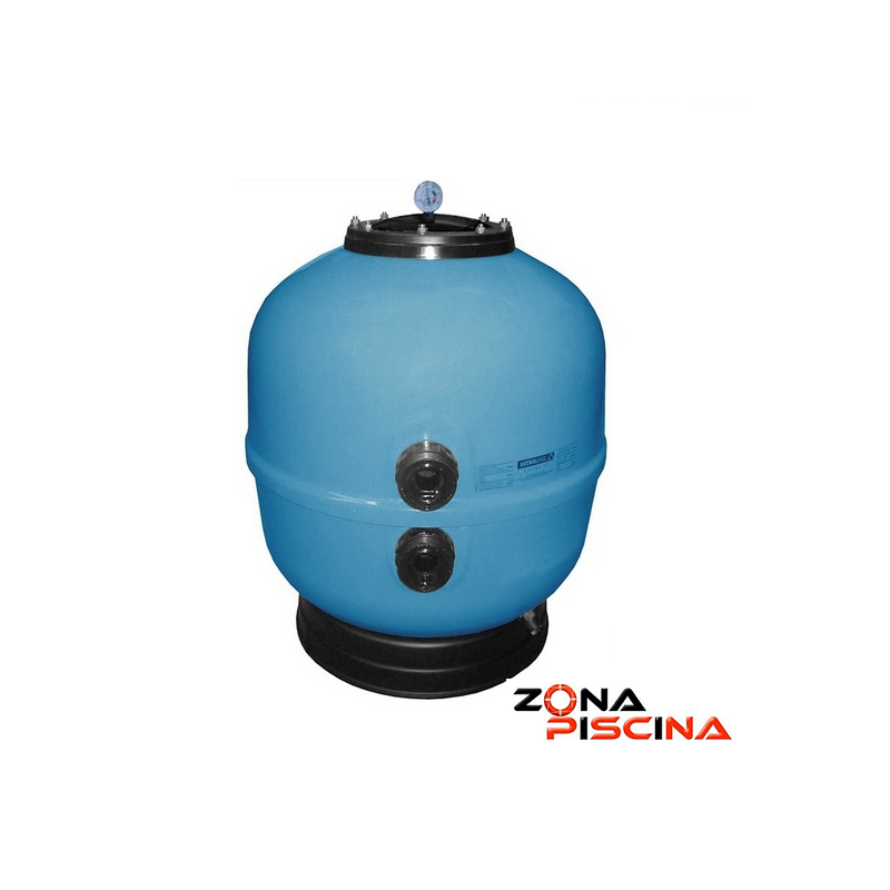 El cuerpo del filtro incorpora un acabado en gelcoat azul RAL 5024, que protege frente a agentes externos y radiación solar. Incluye tapa superior con cierre mediante tornillos, equipada con manómetro y purga de aire, lo que facilita el control de presión y las tareas de mantenimiento del sistema de filtración.