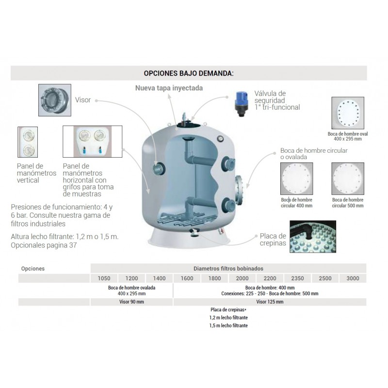 Altura de lecho filtrante opcional de 1,2 m y 1,5 m bajo pedido