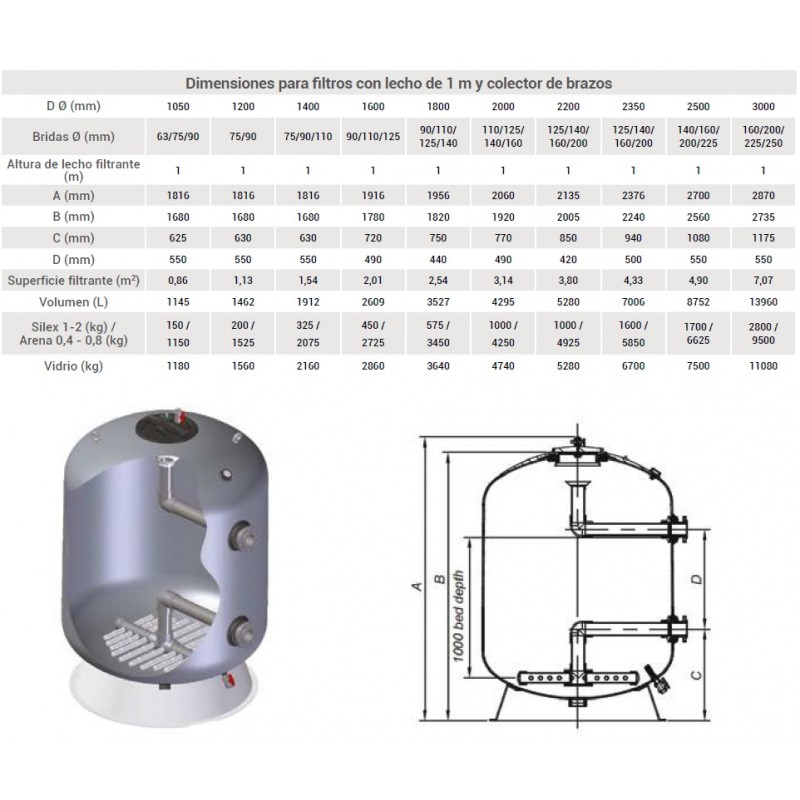 Altura de lecho filtrante estándar: 1 m