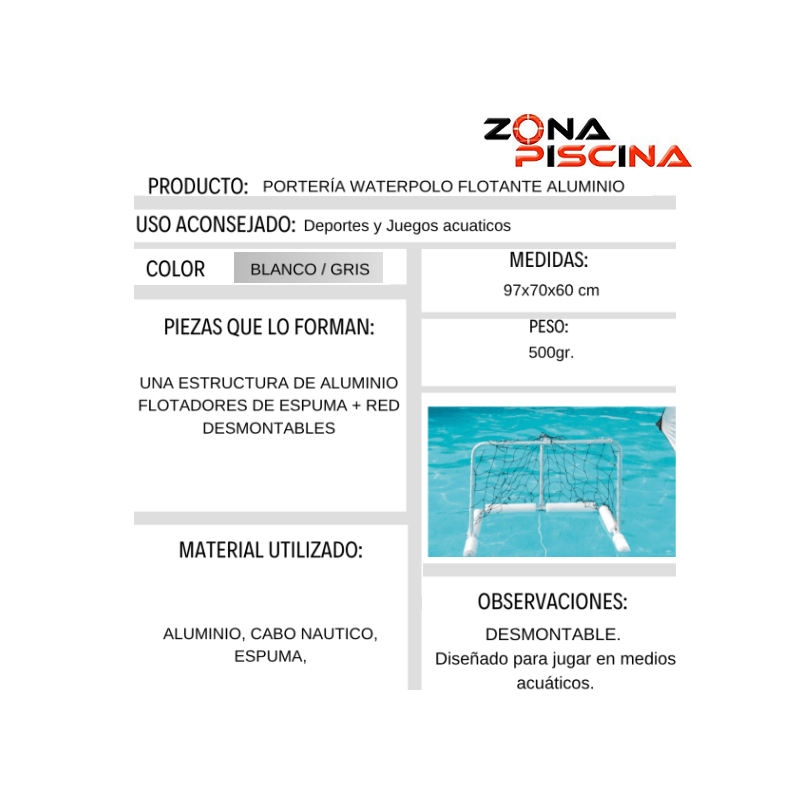 Fabricada en aluminio ligero y duradero, ofrece estabilidad en el agua y un montaje sencillo, ideal para entrenamientos, partidos recreativos y juegos