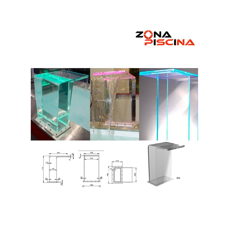 Cascada RIO de agua acrilica con Led RGB para piscinas, spas de uso privado o público.