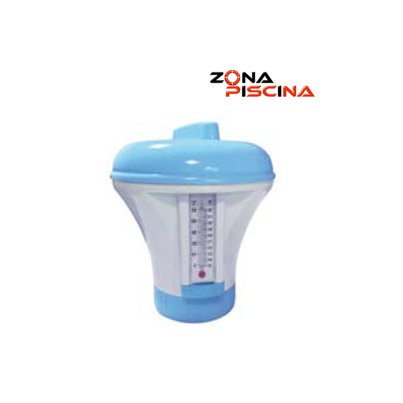 Dosificador flotante piscinas para pastillas de cloro c/ termómetro, con rejilla inferior regulable.