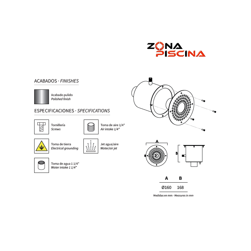 Jet agua aire para piscina, spa en acero inoxidable aisi-316.